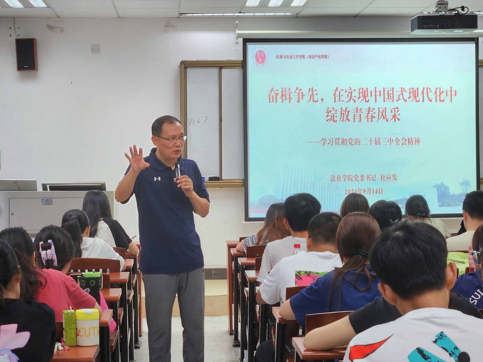 党委书记杜应发以《奋楫争先,在实现中国式现代化中绽放青春风采》为题,为2023法学1班,2023法学2班,2023社会工作1班,2023社会工作2班等100多位同学讲秋季学期思政第一课。