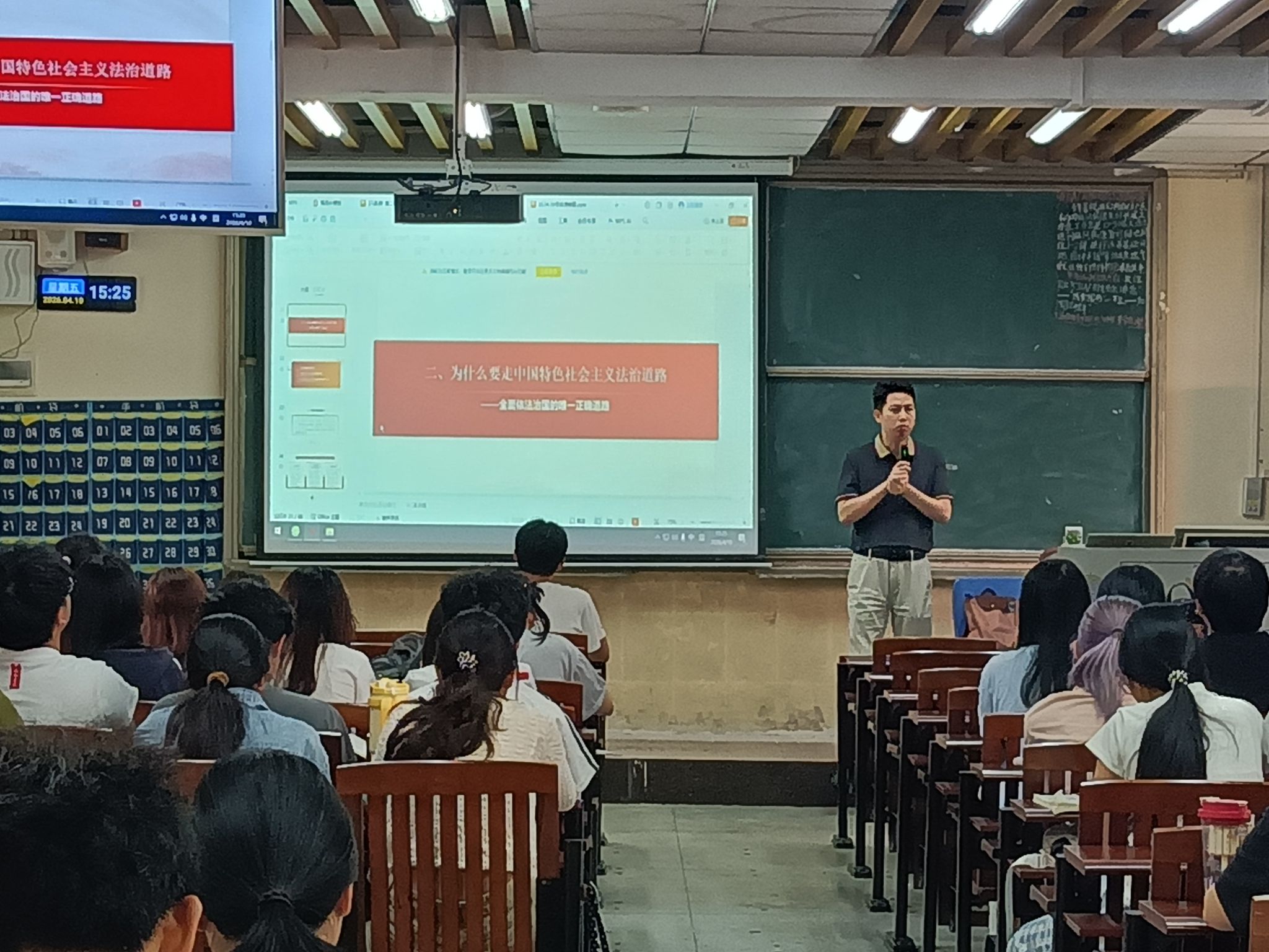 (知识产权学院)副院长黄俊辉以“为什么要走中国特色社会主义法治道路”为主题,给2025级知识产权1班、2025级工商管理1班和2025级工商管理2班的同学讲授春季学期思政第一课,旨在加强同学们对中国特色社会主义法治道路的认同感。