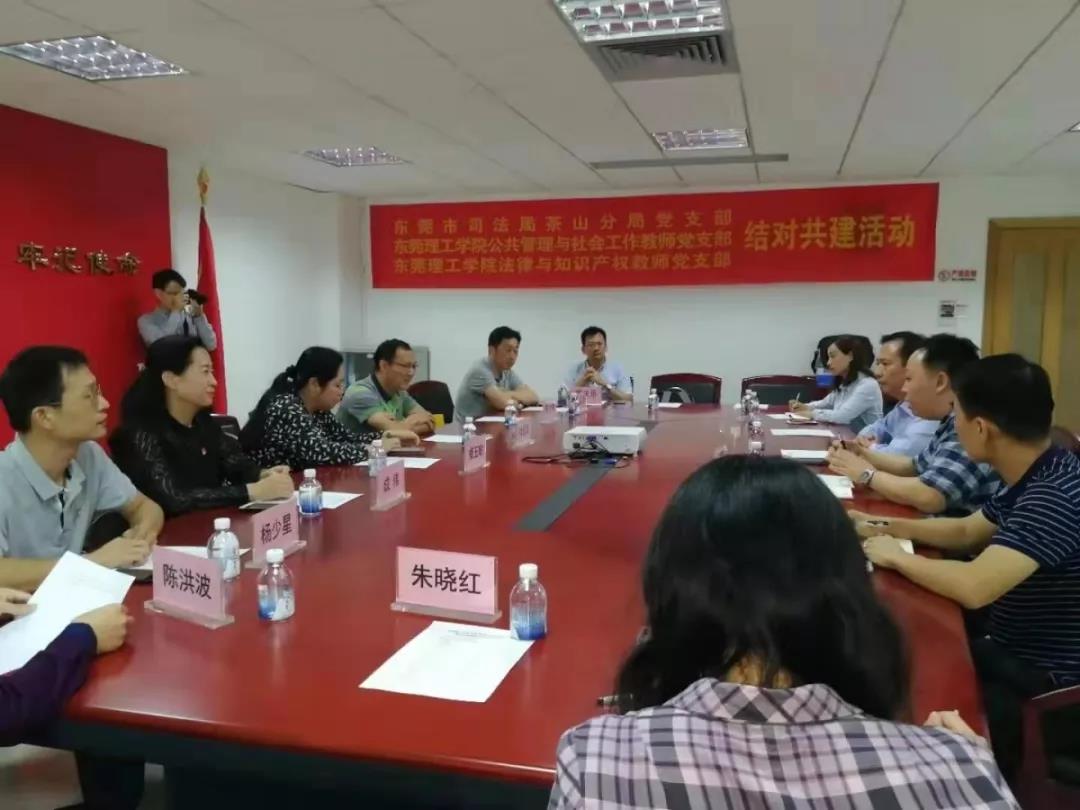 的领导、精英教师们莅临茶山司法分局开展“党建引领结对共建”活动,茶山镇一直以来高度重视基层党建工作,此次校地结对共建活动是双方进一步贯彻落实党的十九大精神、创新高校科研资源与地方社会治理深度融合的有益尝试,也是双方加强交流、优势互补、深化校地合作的重要契机。同时,钟书记还介绍了茶山的经济发展、风土人情以及茶山在社会综合治理工作方面的突出成绩,也希望双方充分发挥各自优势,把地方资源优势与高校科技、人才优势紧密结合,实现合作共赢,结出丰硕成果。