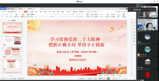 (知识产权学院)党委委员、副院长朱晓红、沈亚萍为教师党支部全体党员以及非党员教师宣讲党的二十大精神。