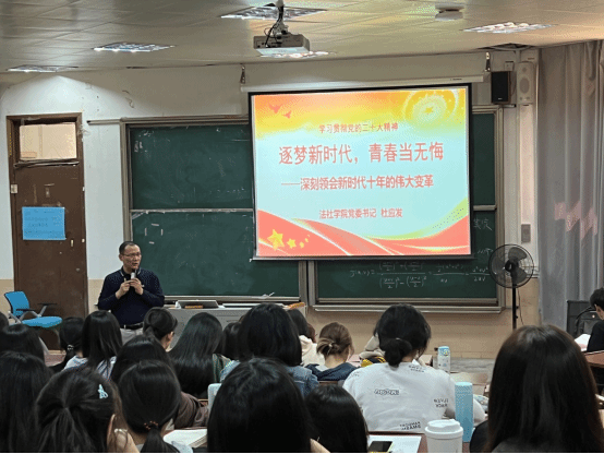 党委书记杜应发以“逐梦新时代,青春当无悔——深刻领会新时代十年的伟大变革”为题为2022法学1、2班,2022社会工作1、2班的同学上了一堂思政课,与同学们共同学习党的二十大精神,全面阐释新时代十年的伟大变革及意义。