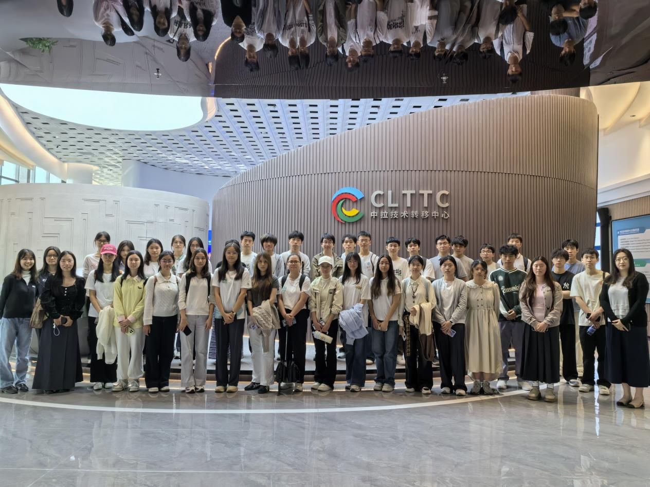 在中心展厅,中拉中心项目主管黄琼立为师生们详细介绍了中心的发展历程与组织架构。她着重讲解了中心以“研、教、商、法”为核心构建的立体化科技合作生态体系,系统展示了中心在推动中拉科技合作交流中取得的丰硕成果。师生们认真聆听讲解,就国际技术转移的实际运作与相关工作人员展开互动。