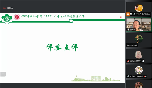 于5月25日晚7:30在腾讯会议举行“心向阳光,青春绽放”“5.25”大学生心理健康月大赛第一阶段的决赛。辅导员谢媚媚、青年教师杨瀚博和心理中心的欧阳晓莹老师担任本次比赛的评委。