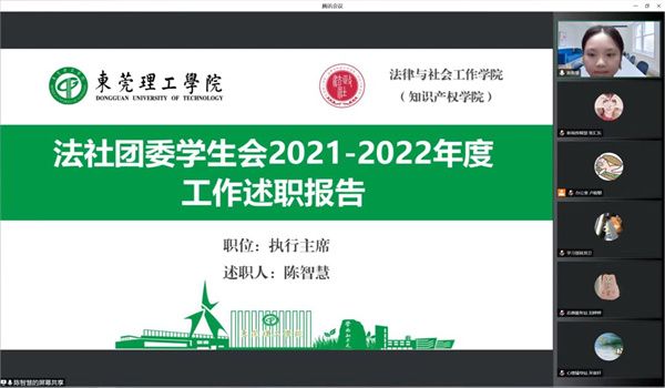 于2022年7月10日晚7:30在腾讯会议软件上举行了团委、学生会述职会议。本次会议由法社团委、学生会执行主席陈智慧主持,学工办主任钟丽华、辅导员邹欢、团委、学生会委员团及团委、学生会各部门的主要负责人出席了此次会议。