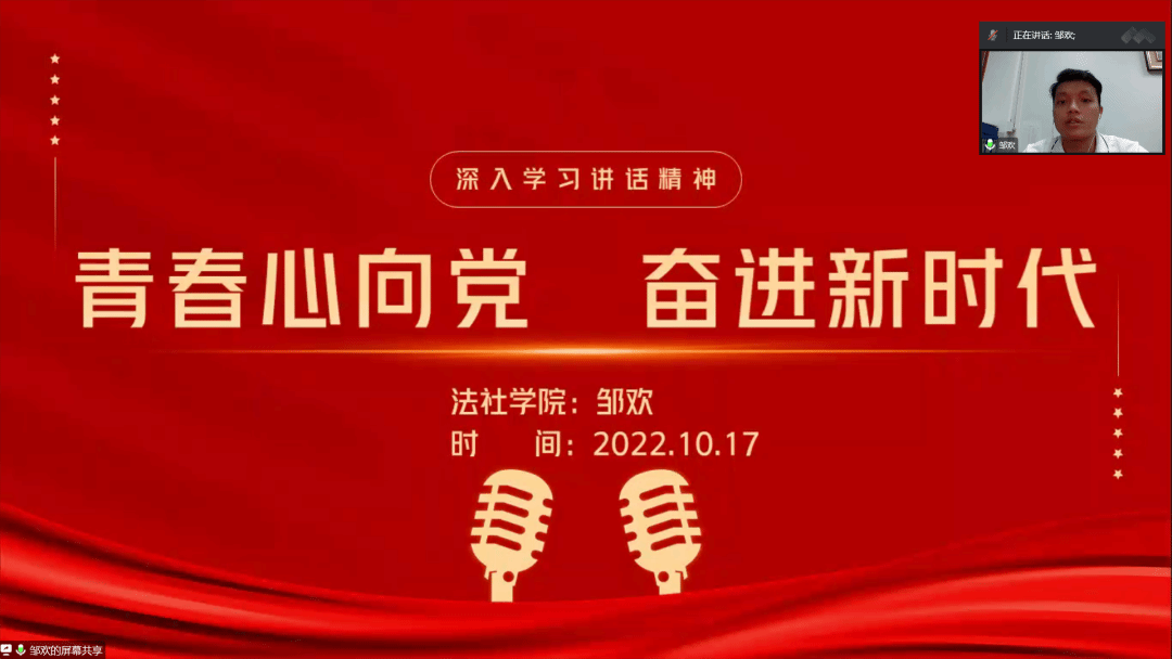 团委、学生会于2022年10月17日20:45在腾讯会议召开秋季培训会。本次会议由我院团委、学生会执行主席卢晓敏主持,辅导员邹欢和法社团学全体成员出席此次会议。