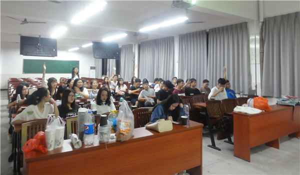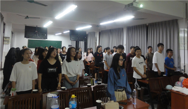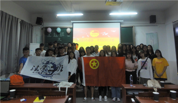 活动伊始,团支书对团日活动做了简要介绍后,由主持人万嘉如主持班会。首先是知识竞赛项目,同学们在限定时间迅速记忆团章、国歌法、国旗法相关内容,之后分组进行举手抢答。比赛场面十分热烈,每次主持人喊完抢答开始,同学们的小手齐刷刷地举起,竞相喊着“我来,我来……”最终比赛以第四小组的胜利画上句号。接着,我们的嘉宾炯纯师姐分享了一些她的学习经验和学生组织活动心得体验,同学们积极提问,师姐也耐心解答。其次便是你演我猜环节。小组选择两位成员观看工作人员播放的《西游记》、《亮剑》等正能量经典影片片段并进行演绎,其他成员负责猜影片名称。薛珊师姐和炯纯师姐也参与其中,演绎的同学声情并茂地将影片内容展示给大家,场上笑声不断。接下来进入观影时间。我们观看纪录片“厉害了,我的国”,感受祖国的飞速发展,虽然一些同学之前已经看过这部影片,但大家还是安静、认真观看。最后,我班同学合唱团歌,拍集体,第一次团日活动完美结束。