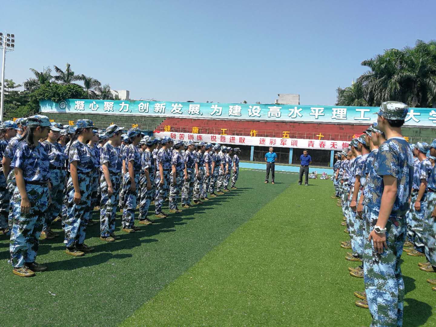 院长强昌文、党总支书记潘荣新、党总支副书记丘永辉以及辅导员、助班到军训连队看望学院2018级军训新生。
