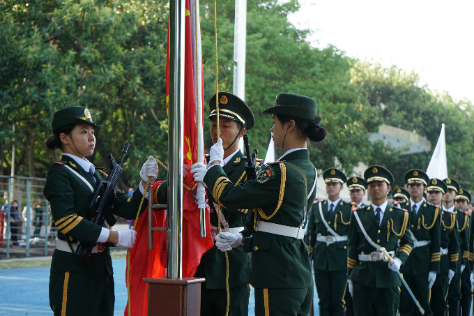 莞城校区迎来了新学期第二次升旗仪式。参加此次升旗仪式的人员有学工部副部长、武装部部长卫红权、莞城校区学工办老师、各二级学院党总支副书记、辅导员、学生党员以及2017级全体学生。