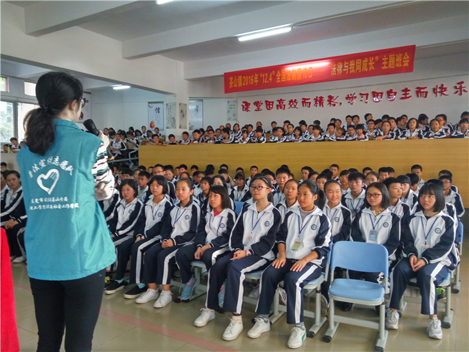 团总支法律宣传志愿服务队为紧密与茶山司法分局的合作和深入志愿普法活动,同茶山社区的工作人员及社区矫正人员来到茶山镇誉华学校,为初中部的学生进行法制教育主题班会的授课以及为小学部学生开展法治宣传普法游园活动。