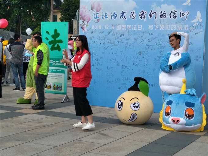 刘海波老师带领同学们到活动现场为市民提供法制宣传志愿服务,并有部分同学扮演“法娃”进行了节目演出。