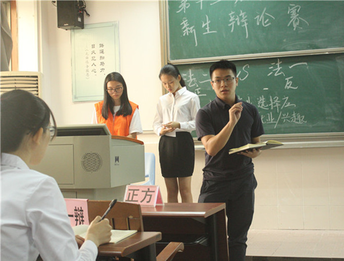 此轮小组赛就“大学生专业选择更多考虑就业还是更多考虑兴趣”这一辩题开展三场比赛。三场比赛的正反双方分别为法学2班和法学1班、社会工作2班和社会工作1班、法学卓越班和行政管理1班。