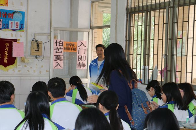 在到达厚街中学后,志愿站的干事先将寄语交给高三级的郑级长阅览,郑级长高度赞扬了本次志愿站的送寄语活动。郑级长阅览寄语后,便亲自带领干事们到高三各班级分发寄语。