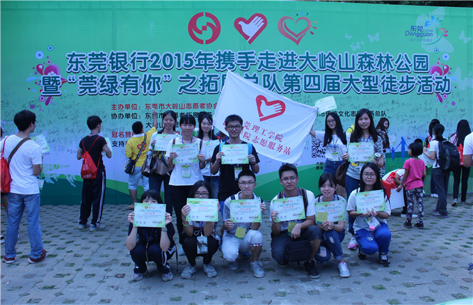 2015年10月25日上午九点,由东莞爱心志愿者协会和东莞市大岭山志愿者协会联合举办的2015年携手走进大岭山森林公园暨“莞绿有你”之拓展总队第四届大型徒步活动正式开始。政法学院志愿服务站的干事们参与了本次徒步活动。