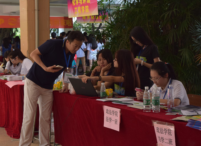 9月6日,政法学院第16届团学组织干部、大二各班志愿者以及15级的新生骨干早早到位,于莞城校区三号楼底张贴好迎新海报、拉好横幅,迎接新生的活动一切准备就绪。政法学院党总支书记潘荣新、辅导员邓磊老师、刘海波老师更莅临了政法学院的迎新活动现场并对迎新工作做出相关指导。