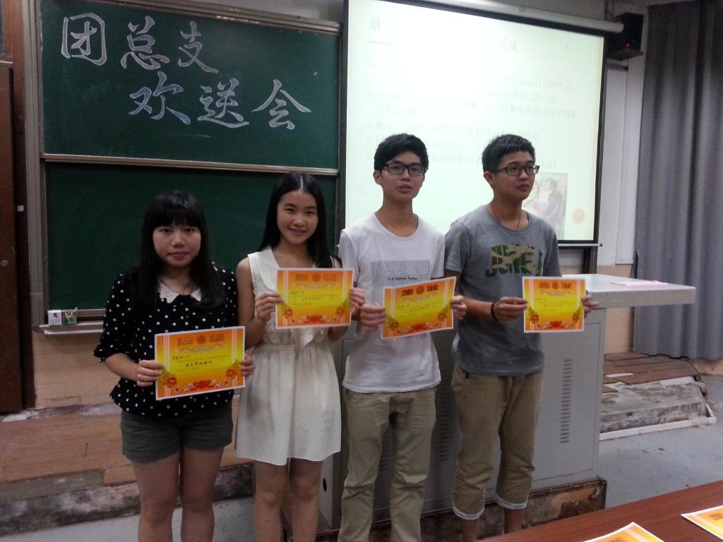 欢送会在轻松、愉悦的氛围中开始。每个部门都进行了有趣幽默的部门展示。而在部门展示中间还穿插了不同的游戏环节,干事们都玩得十分开心,炒热了气氛。接下来,我们进行了一年一度的“每年之星”颁奖,给每个书记和每位部长及副部长颁奖各个部门的干事分别给自己的部长宣读了颁奖词,表达了自己对部门和每个同伴的感谢之情。各个书记和部长总结了这一年的工作,分享了一些自己的看法和建议。第一副书记叶灏彬师兄分享了自己的工作经历,鼓励干事们积极参加学生工作,同时对团总支表达了自己的不舍,希望团总支能越做越好。最后,欢送会在团总支全体成员齐唱《最美的太阳》中落下帷幕,大家来合影来铭记这一个难忘的时刻。