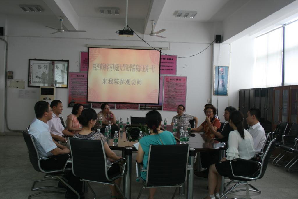 5月30日,华南师范大学法学院院长王涛、名誉院长崔卓兰教授等一行来到政法学院进行访问。座谈会上,我院党政班子成员及法学教研室部分骨干教师与来宾们作了广泛深入的交流,双方在教学管理制度、法硕建设以及司法考试辅导等方面互通有无,促进了双方的专业联系,为日后双方的资源共享、办学合作奠定了基础