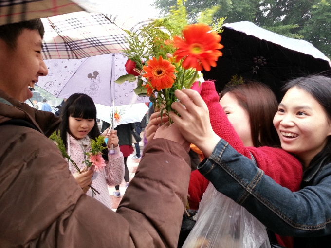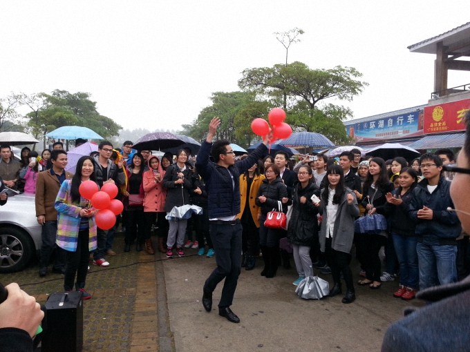 下午2点,艾炜特公司的员工与志愿者们聚集在一起,手里捧着鲜花,向路上的行人派送鲜花并送上祝福。紧接着,当看到有红色气球升起时,众多人聚集靠拢,音乐响起,大家一起唱起«幸福拍手歌»等歌曲,吸引了很多游客。然而当音乐结束,人群突然间散去,上演了一场音乐快闪。一个小时后,活动圆满结束。虽然今天有蒙蒙细雨,但是还是不减艾炜特员工和志愿者的热情。借此次活动,也证明了:东莞有爱。