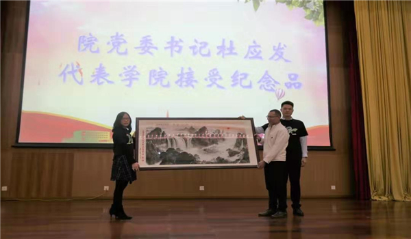 全体2009届的毕业生还为母校准备了一份精美的礼物。由杜应发老师代表学院接受纪念品。杜老师表达了对大家的美好祝愿,也希望大家能通过这次的平台来更好地表达。在仪式彩蛋环节中,李益民老师为大家准备了他亲笔写的墨宝