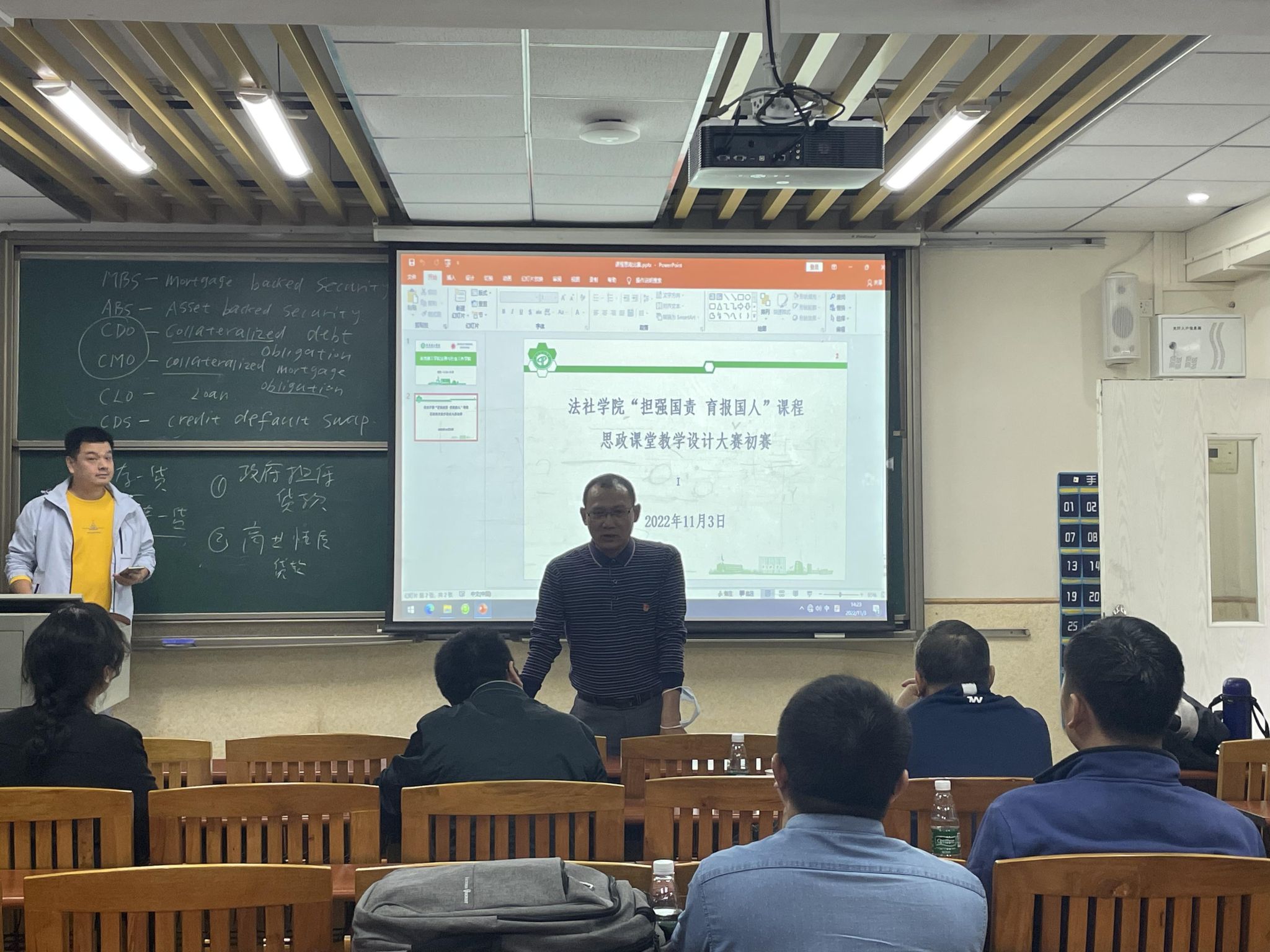 于11月3日下午在在莞城校区5308教室举行了主题为“担强国责 育报国人”的课程思政课堂教学设计大赛初赛。学院党委书记杜应发、副院长朱晓红以及教学指导委员会评委、参赛的师生代表共约20多人参加了此次比赛。