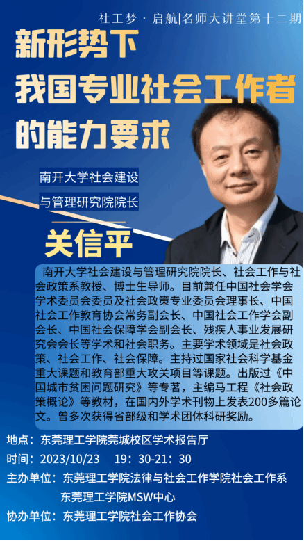 2023年10月23日晚19:30,社会工作系专业品牌活动:社工梦·启航|名师大讲堂第12期讲座在莞城校区学术报告厅举办。本次名师大讲堂邀请到了我国著名社会学家、南开大学博士生导师关信平教授为我校师生做《新形势下我国专业社会工作者的能力要求》的报告。出席本次活动的主要有社会工作系全体学生,av在线