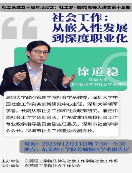 2023年12月13日晚19:30,社会工作系专业品牌活动:社工梦启航|名师大讲堂第十三期深圳大学徐道稳教授讲座在莞城校区学术报告厅顺利开展。此次,社会工作系邀请深圳大学政府管理学院社会学系徐道稳教授为我校师生与东莞一线社工做《社会工作:从嵌入性发展到深度职业化》的报告。我院成伟主任、张雪副主任、居正老师、张子庄老师、党曦博士出席本次活动,同时也邀请了东莞众多一线社工聆听此次讲座。