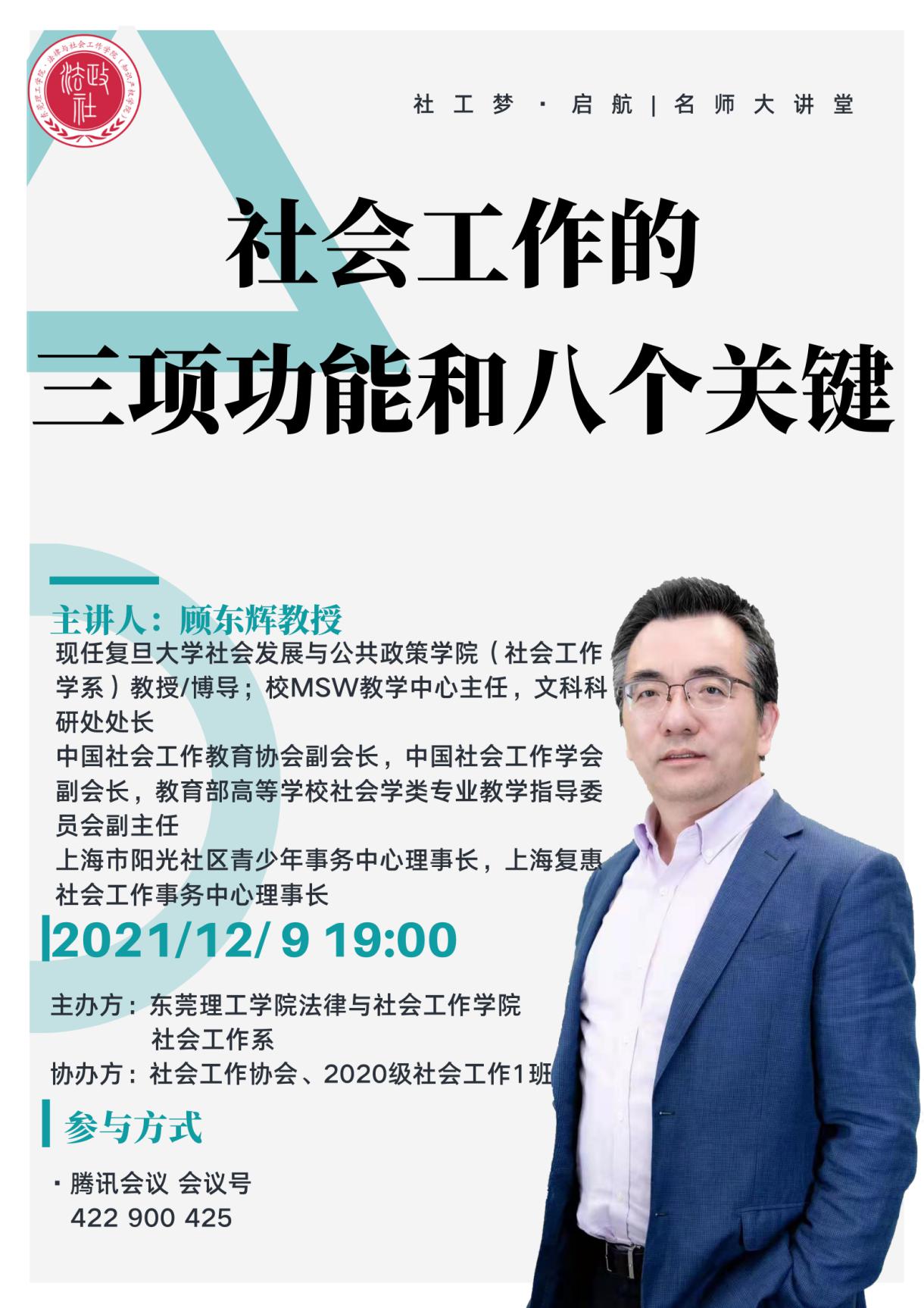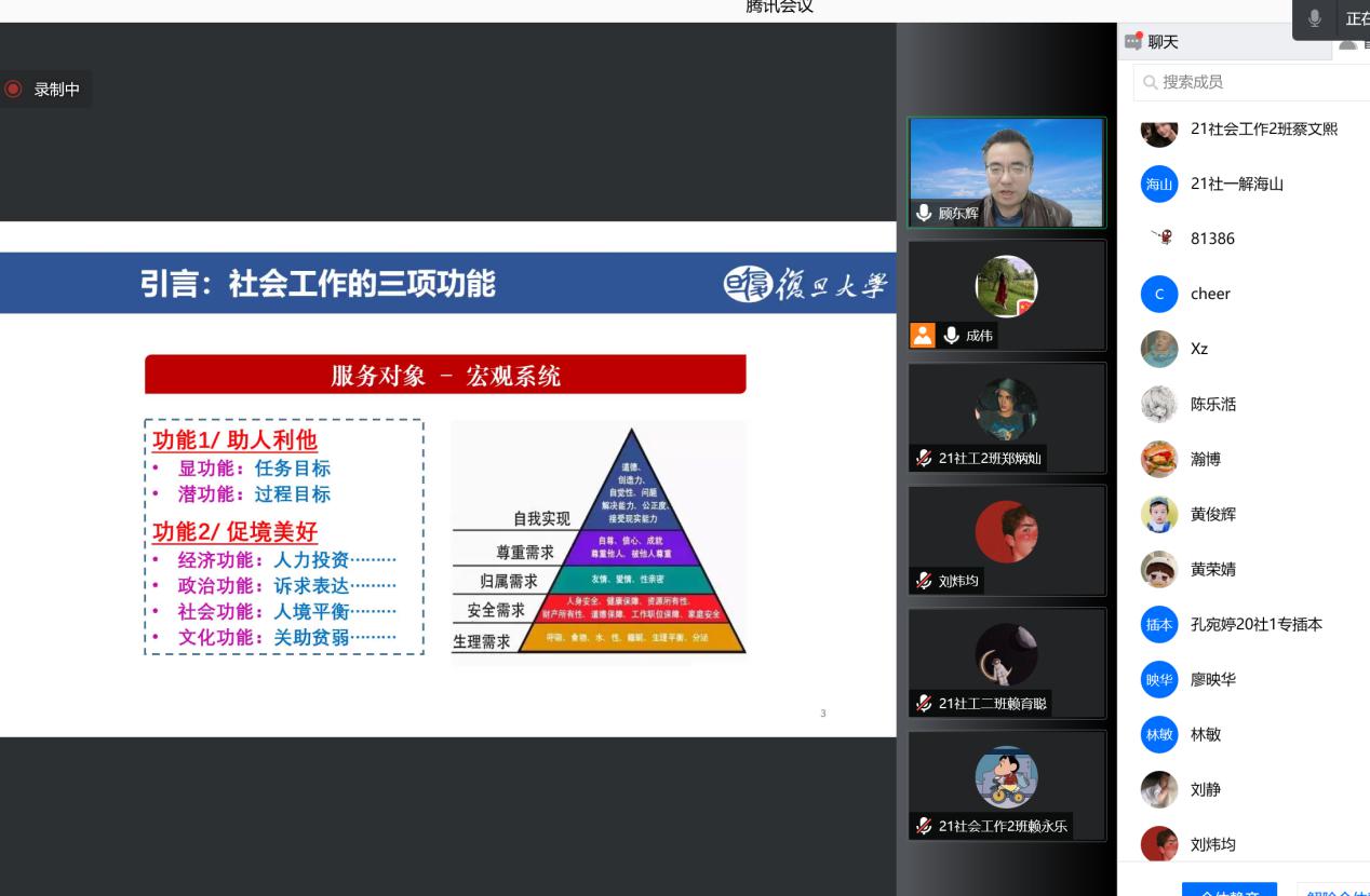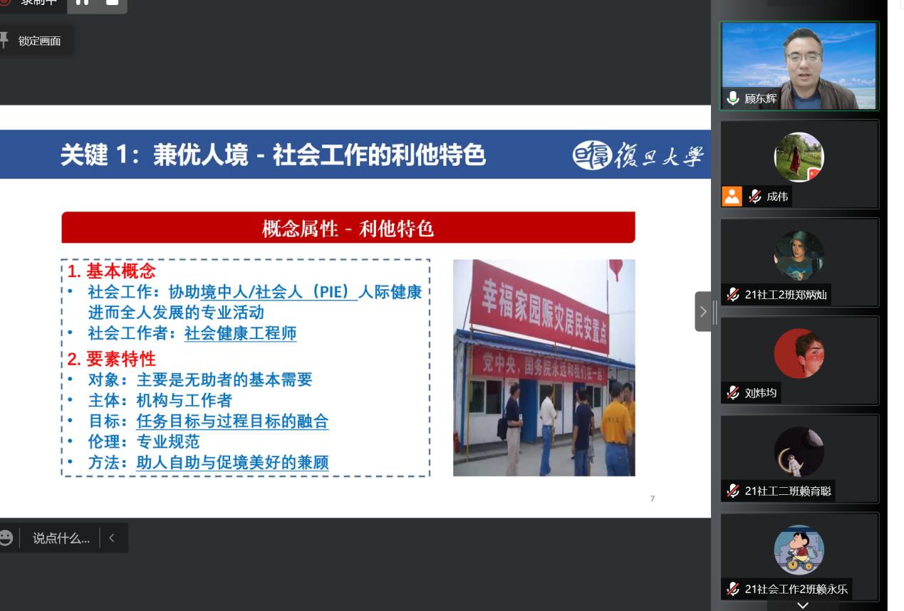 (知识产权学院)社会工作系在线上举办了社工梦·启航|名师大讲堂线座。本次讲座特邀中国社会工作教育协会副会长、教育部高等学校社会学类专业教学指导委员会副主任委员、复旦大学社会发展与公共政策学院(社会工作系)教授、博导顾东辉做“社会工作的三项功能和八个关键”的主题报告。社会工作系系主任成伟教授主持本次讲座,社会工作系全体教师及学生参加了本次讲座,同时还有来自全国其他高校的师生、一线社会工作者共计近400人参与了本次线上活动。