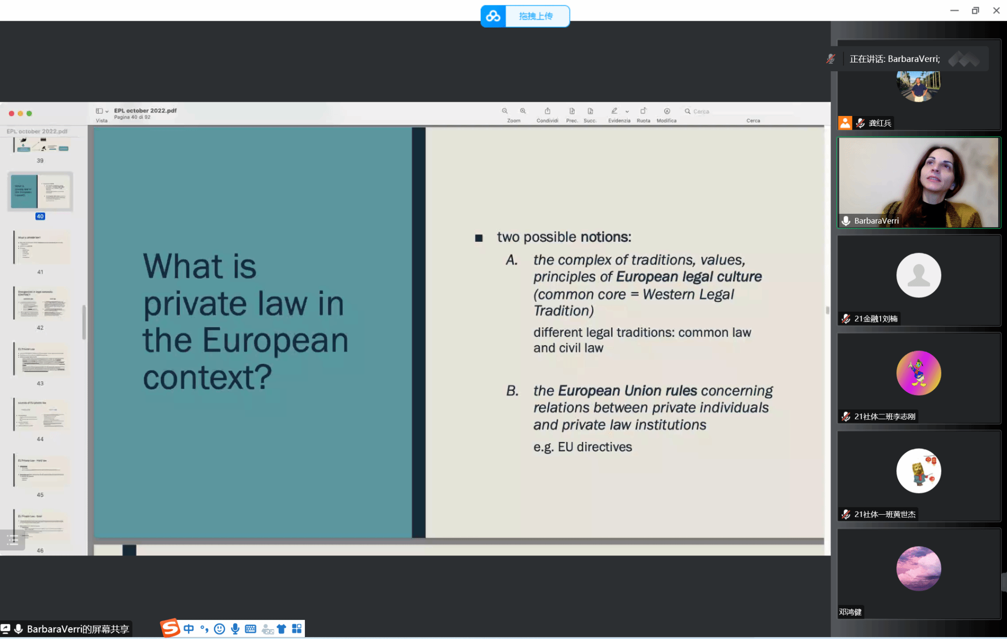在线上开展了以“欧盟框架下的私法统一”为主题的讲座,由博洛尼亚大学法学院Barbara Verri教授担任主讲人,知识产权系系主任龚红兵副教授担任主持人。
