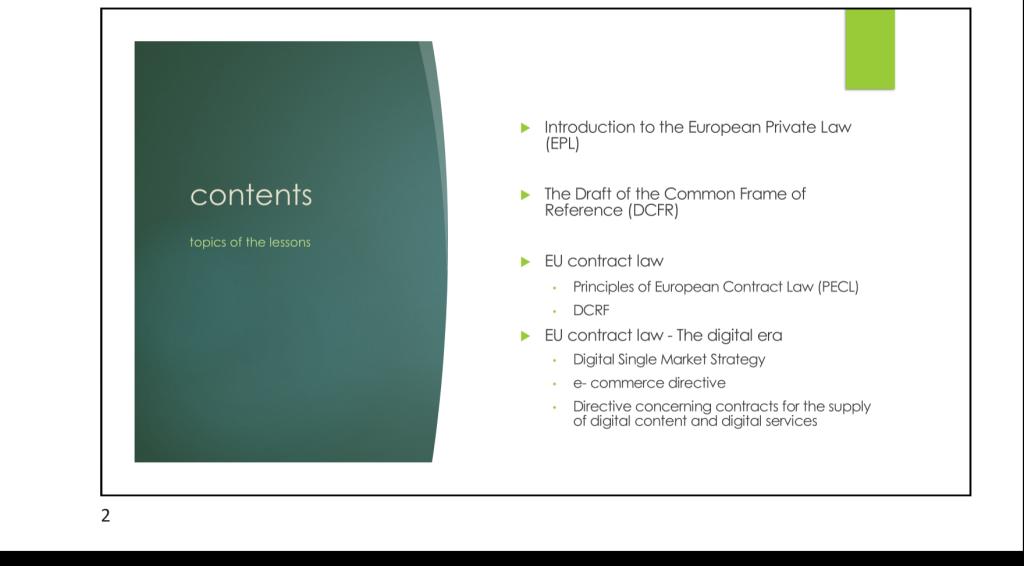 2020年7月15日,Dr. Barbara Verri的《欧洲私法概述》(The General Introduction to the European Private Law)国际课程正式开始,为期4天,共16个课时,课程内容包括:1、欧洲私法介绍、欧洲私法的渊源、实现欧洲私法统一的法律手段(Legislation measures and soft law);2,重点讲授了《The Draft common Frame of Reference》(共同参考框架草案)也称“欧洲民法典草案”的立法过程、立法目的、实现途径和主要框架;3,欧洲合同法的主要原则、欧洲消费者保护指令、以及数字经济下,欧洲数字电子合同指令和数据保护条例的主要内容。
