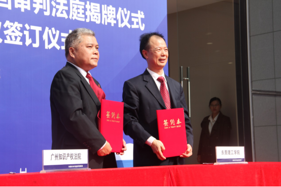 继今年9月15日我校和市市场监督管理局签署合作框架协议、共同建设东莞知识产权学院后,12月26日上午,在“广州知识产权法院东莞巡回审判庭和东莞市中级人民法院巡回审判庭”揭牌仪式上,李忠红副校长代表我校再次和广知知识产权法院、东莞市中级人民法院签署知识产权战略合作框架协议。三方约定,在知识产权人才培养、 东莞市知识产权纠纷调解委员会和知识产权宣传培训机制建设、以及知识产权相关理论和审判实务问题研究等方面进行全面合作。