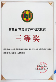 在2025年第三届“东莞法学杯”征文比赛中,由张芷瑄、时思阳、蒋钰三位同学合作完成的作品《东莞跨境电商面对海外诉讼下TRO临时禁令的应对措施》,经多轮严格评审,成功斩获三等奖。