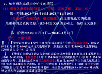 大学生毕业设计(论文)管理系统中完成,所以,龚老师特别要求同学们高度重视各各个毕业论文撰写工作中的重要的时间节点,否则,系统关闭,无法上传。此外,龚老师还特别强调了同学们认真做好毕业论文撰写过程中的指导记录,指出同学们的毕业论文指导记录从10月14日开设,每周做好两次指导记录。