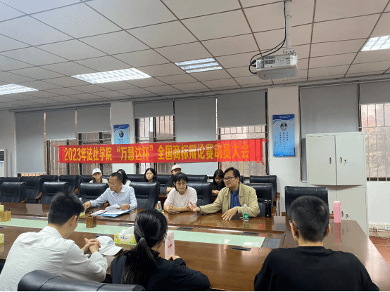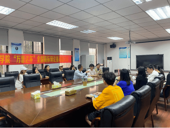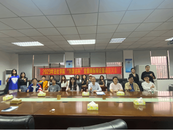 知识产权系主任龚红兵老师、杨婧老师、胡庆乐老师以及商标辩论赛的全体参赛队员在莞城校区5201会议室召开了2023年av在线