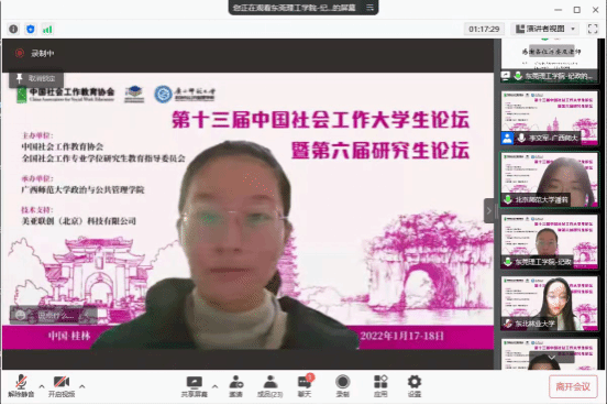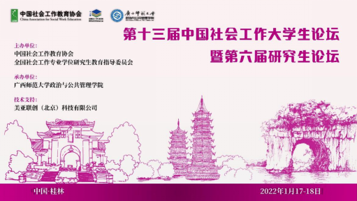 1月17日至18日,由中国社会工作教育协会和全国社会工作专业学位研究生教育指导委员会主办的第十三届中国社会工作大学生论坛暨第六届MSW研究生论坛在广西师范大学顺利举办。本论坛是国内社会工作领域专业水平最高的全国性大学生学术论坛,吸引了来自北京大学、南开大学、复旦大学、南京大学、华东理工大学等多所高校的数百名社会工作专业本科生、硕士研究生和博士研究生参会,共计收到400多篇论文。受疫情的影响,本次论坛采用线上方式。