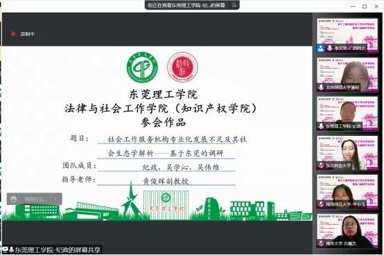 社会工作系高度重视,精心组织、安排专任教师对学生进行全程指导。其中,由黄俊辉副教授指导的由2019级社会工作专业的纪政、吴学沁和2019级法学专业的吴伟维组成的课题组完成的论文《社会工作服务机构专业化发展不足及其社会生态学解析——基于东莞的调研》成功入选。纪政同学受邀在本科生分论坛上发言。经过初审和PPT展示两个环节的激烈角逐,纪政等同学的论文在入选的400多篇论文中荣获本科组二等奖,并在本科组二等奖中位列第一。