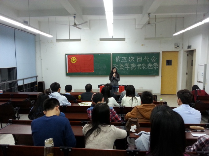 第五次代表大会政法学院代表选举大会。邓磊(团长)、校学生会主席刘裕颖、政法学院团总支副书记袁智勋、政法学院学生会主席叶创新、莞青论坛主任潘才彬、政法学院党建办主任李春志以及团总支委员、各团支部代表出席会议。